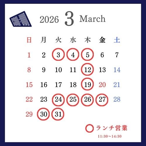 ■ランチ営業時間:11:30~14:30(L.O.14:00)