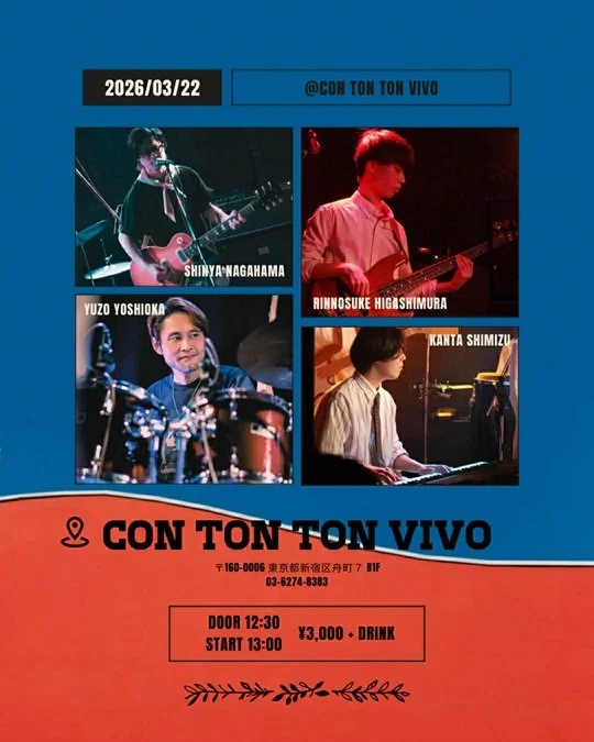 長浜伸也(G,Vo)東村凛乃介(B)清水カンタ(Key)吉岡優三(Ds)[MUSIC][昼公演] Sunday, March 22, 2026 12:30 PM 4:00 PM 12:30 16:00 Google Calendar ICS 日時:2026年3月22日(日) 12:30 OPEN, 13:00 START チャージ:¥3,000出演:長浜伸也(G,Vo)東村凛乃介(B)清水カンタ(Key)吉岡優三(Ds)ご予約はこちらから→