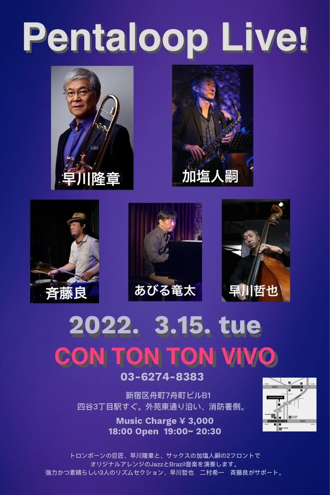 Pentaloop Live![MUSIC][夜公演] Tuesday, March 15, 2022 6:00 PM 9:00 PM 18:00 21:00 Google Calendar ICS 日時:2022年3月15日(火) 18:00 OPEN, 19:00 START チャージ:¥3,000メンバー:早川隆章(Tb)加塩人嗣(Sax)早川哲也(B)斉藤良(Ds)あびる竜太(P)ご予約はこちらから→