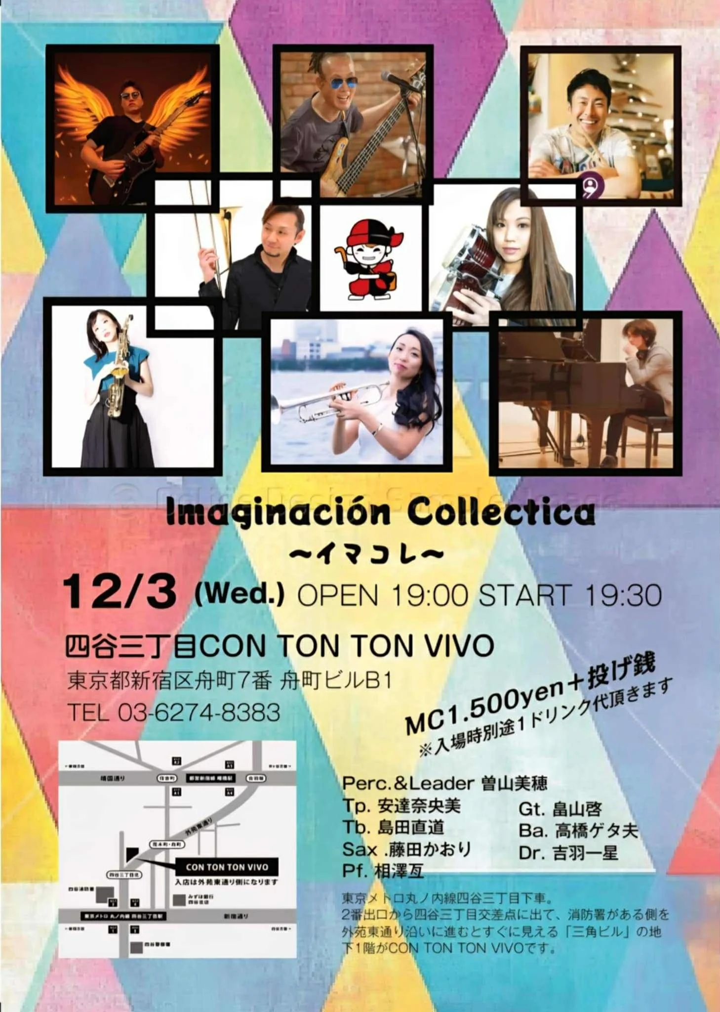 Imaginación Collectica ~イマコレ~[MUSIC][夜公演] Wednesday, December 3, 2025 7:00 PM 10:00 PM 19:00 22:00 Google Calendar ICS 日時:2025年12月3日(水) 19:00 OPEN, 19:30 START チャージ:1,500円 +投げ銭出演:曽山美穂(Perc,Leader)安達奈央美(Tp)藤田かおり(Ts)島田直道(Tb)相澤亙(Pf)畠山啓(Gt)高橋ゲタ夫(Ba)吉羽一星(Dr)ご予約はこちらから→