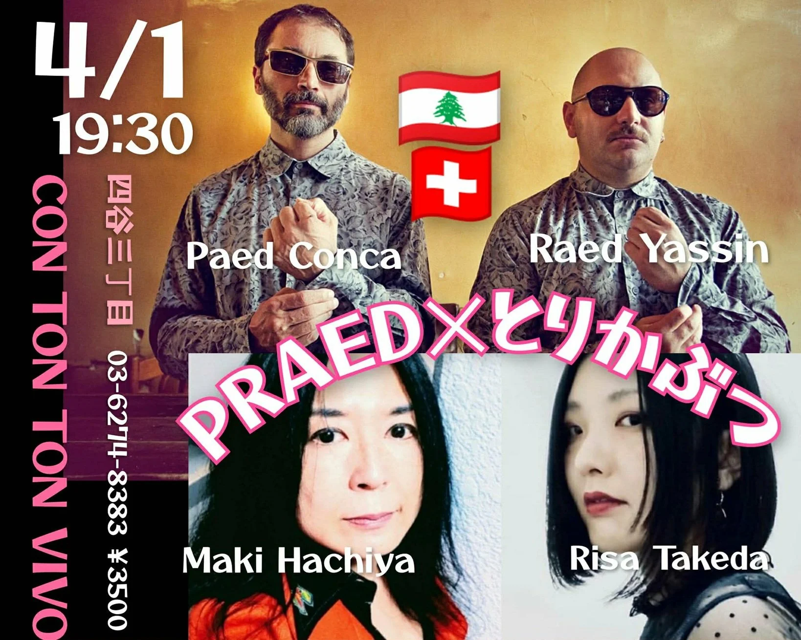 【PRAED×とりかぶつ】[MUSIC][夜公演] Wednesday, April 1, 2026 7:00 PM 10:00 PM 19:00 22:00 Google Calendar ICS 日時:2026年4月1日(水) 19:00 OPEN, 19:30 START チャージ:¥3,500出演:Paed Conca(clarinet,effects)Raed Yassin(laptop,effects.vo)蜂谷真紀 (voice,effects,key,pf)武田理沙(syn,effects.drums)ご予約はこちらから→