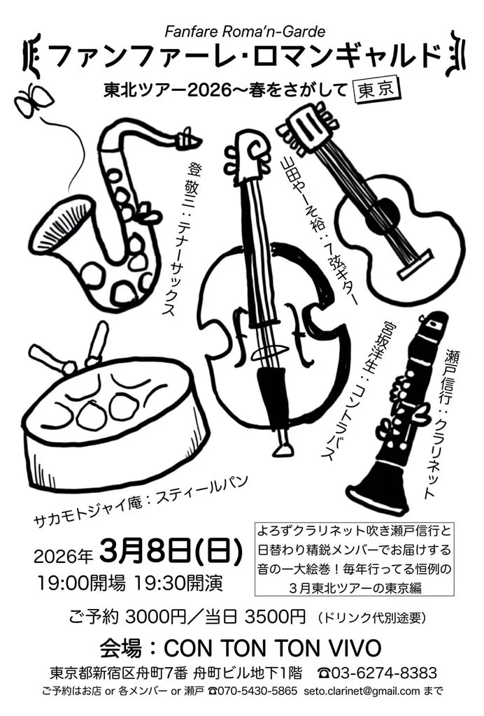 ファンファーレ・ロマンギャルド東北ツアー2026春をさがして~東京[MUSIC][夜公演] Sunday, March 8, 2026 7:00 PM 10:00 PM 19:00 22:00 Google Calendar ICS 日時:2026年3月8日(日) 19:00 OPEN, 19:30 START チャージ:予約3000円/当日3500円(ドリンク別)出演:Fanfare Roma'n-Garde(ファンファーレ・ロマンギャルド)瀬戸信行(Clarinet)登 敬三(Txenor Sax)サカモトジャイ庵(Steelpan)山田やーそ裕(7-strings guitar)助っ人:宮坂洋生(Contrabass)ご予約はこちらから→