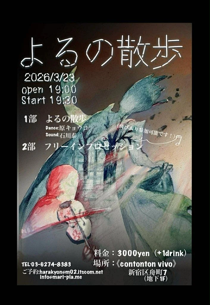 東京インプロカーニバルpresents[MUSIC][夜公演] Monday, March 23, 2026 7:00 PM 10:00 PM 19:00 22:00 Google Calendar ICS 日時:2026年3月23日(月) 19:00 OPEN, 19:30 START チャージ:¥3,0001部「やみ夜の散歩」石川泰(Sounds)原キョウコ(Dance)2部「フリーインプロセッション」(飛び入り可能です!お好きな楽器や声、言葉など)ご予約はこちらから→
