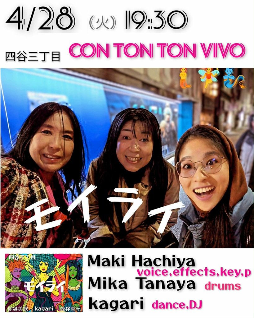 【モイライ】[MUSIC,DANCE][夜公演] Tuesday, April 28, 2026 7:00 PM 10:00 PM 19:00 22:00 Google Calendar ICS ギリシャ神話「三女神」モイライ!自由の園へ!日時:2026年4月28日(火) 19:00 OPEN, 19:30 START チャージ:¥3,000出演:蜂谷真紀(Voice,Effects,P,Key)Kagari(Dance,DJ)棚谷美歌 (Ds)ご予約はこちらから→
