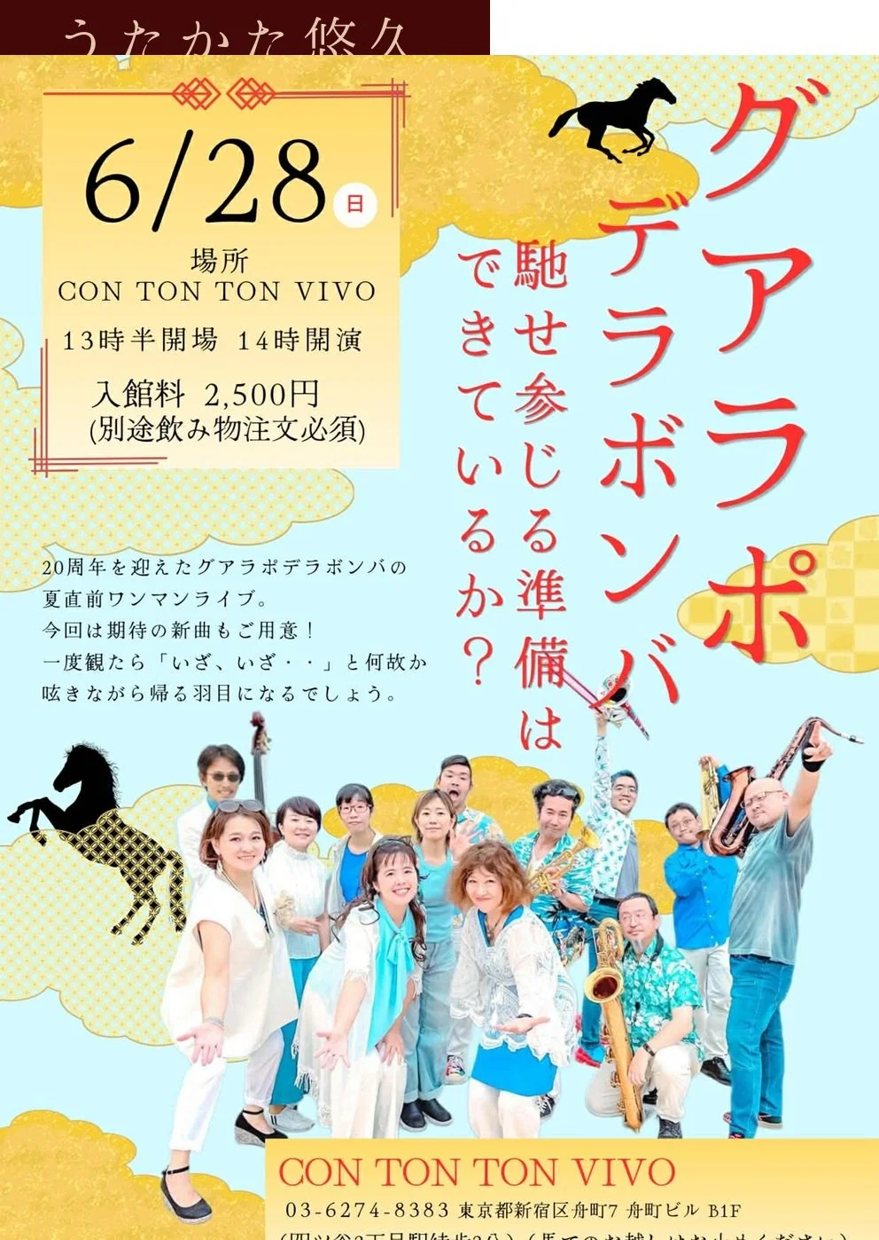 Guarapo de la Bomba[MUSIC][昼公演] Sunday, June 28, 2026 1:30 PM 4:00 PM 13:30 16:00 Google Calendar ICS Guarapo de la Bomba LIVE at CON TON TON VIVO「馳せ参じる準備はできているか?」20周年を迎えたグアラポデラボンバの夏直前ワンマンライブ。今回は期待の新曲もご用意!一度観たら「いざ、いざ・・」と何故か呟きながら帰る羽目になるでしょう。日時:2026年6月28日(日) 13:30 OPEN, 14:00 START チャージ:2,500円出演:Guarapo de la Bombaご予約はこちらから→